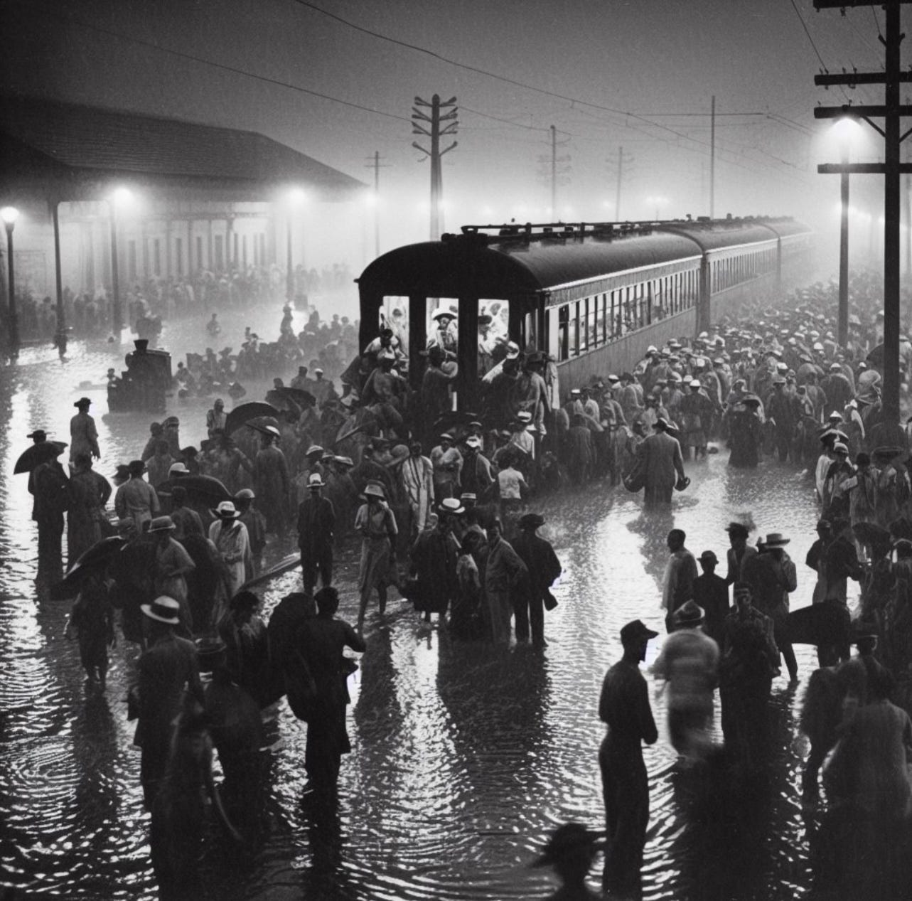 But the sense of relief would turn out to be excruciatingly short-lived, as the station officials, in a single, heart-dropping, gut-wrenching moment, tediously informed the prospective evacuees that the last trains could no longer depart out of the town. For the people onboard those very train cars, lumps surely swelled in their throats. We can intuitively surmise, that with numb legs, they shuffled back outside, stepping down and splashing back into the floodwaters and back into the fear, feeling their skin once again pelted by the thrashing rain.