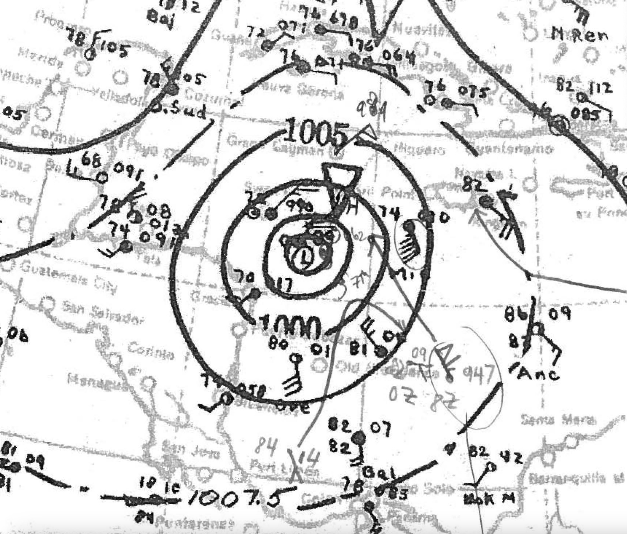 The following day—Halloween, 1932—the wave had reached the island of St. Lucia, where local weather stations briefly recorded a dip in atmospheric pressure down to 1,008 millibars. While slight, this verified that the wave was indeed attempting tropical cyclogenesis. The youthful seedling of a storm crossed the threshold of the Caribbean’s doorstep later that night, eager and hungry for the candy of hot seawater that lay ahead. She would attain tropical storm force winds punctually afterwards, becoming the 14th confirmed storm of the ‘32 season… before disappearing into the satellite-free seclusion and haze of night as she moved steadily west.