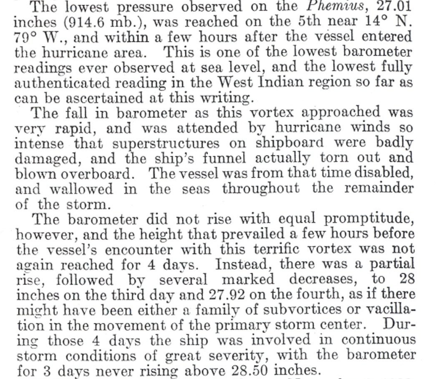 Phemius would never make it in the eye of the Hurricane that hellish morning of the 6th, but they were entrenched thickly in the pure, unimaginable violence of Fourteen’s extremely robust eyewall. And it was there, between the gnashing teeth of winds that the Phemius’ crew estimated to have been as high as ~200 mph (translating roughly to ~175 mph sustained), that one of the most profound and historic raw, in-real-time barometric air pressure readings was ever recorded. At the height of the storm, the inches of mercury onboard the Phemius fell down to an ear-shattering 914.5 millibars—and it was the fact that this observation occurred inside Fourteen’s eyewall, and not within her eye, that meant her true pressure was much, much lower.
